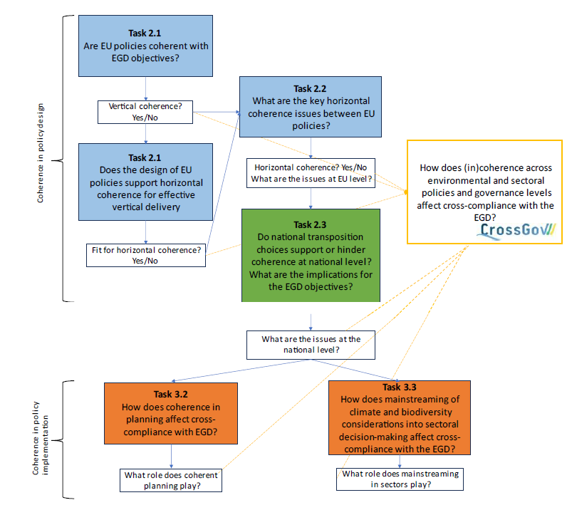 For example: How does the degree of coherence across environmental and sectoral policies and governance levels affect progress towards achieving cross compliance with the selected EU EGD goals and target ?